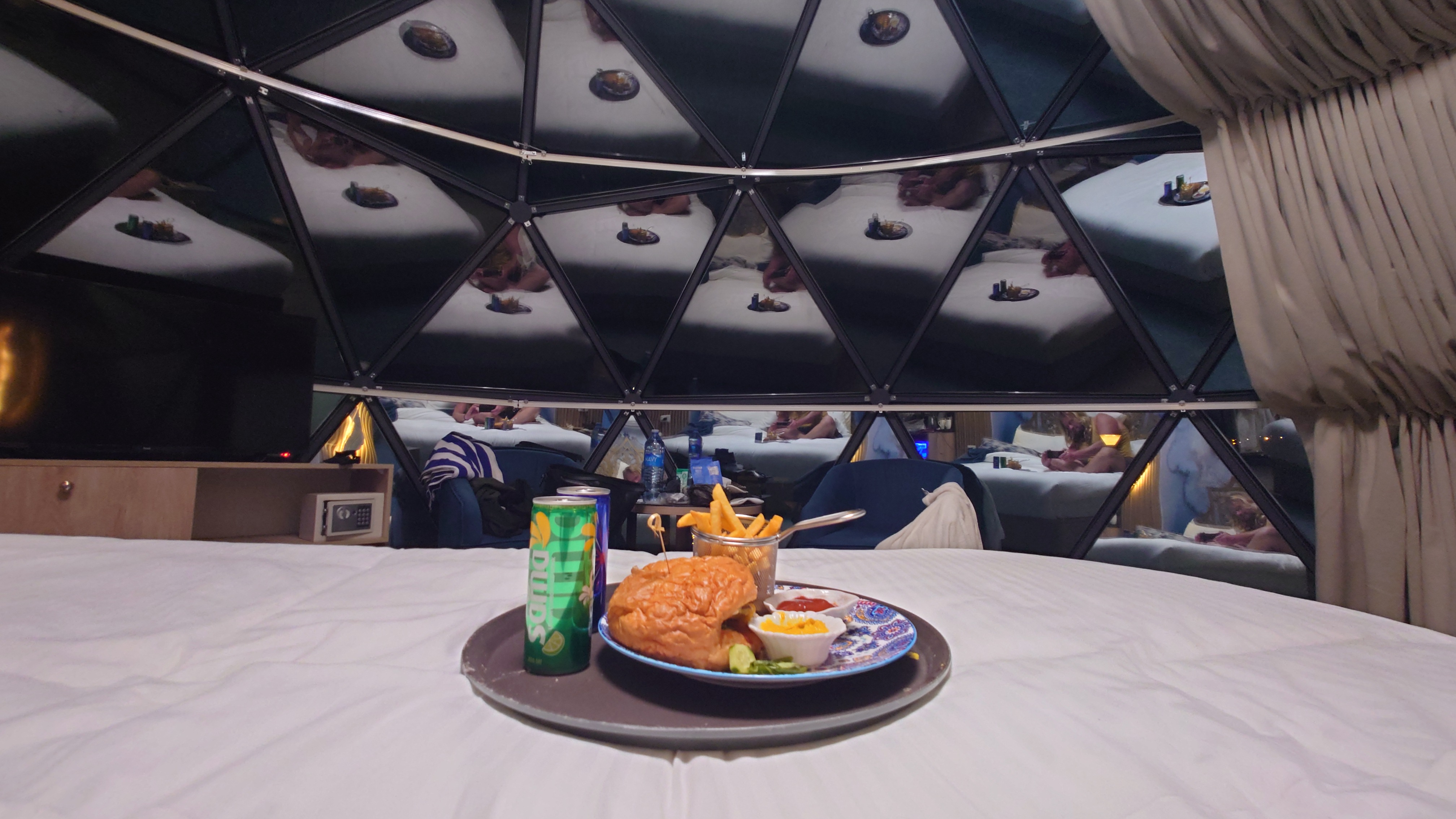 Als Allah gerufen wurde, klopft es an meiner Tür. Der Rezeptionist hat sich Burger gemacht und Pizza. Er bringt mir auch etwas davon aufs Zimmer mit den Worten "Vielleicht schmeckts nicht gut, ich habs gemacht. Ist ja keiner da." Mir egal. Es ist perfekt. Ich esse auf dem Bett und bin irritiert, dass ich in der Spähre an die 20 Reflektionen meines Essens widergespiegelt bekomme. Ein bisschen muss ich an La Palma zum Lockdown denken, in denen ähnlich improvisiert werden musste.