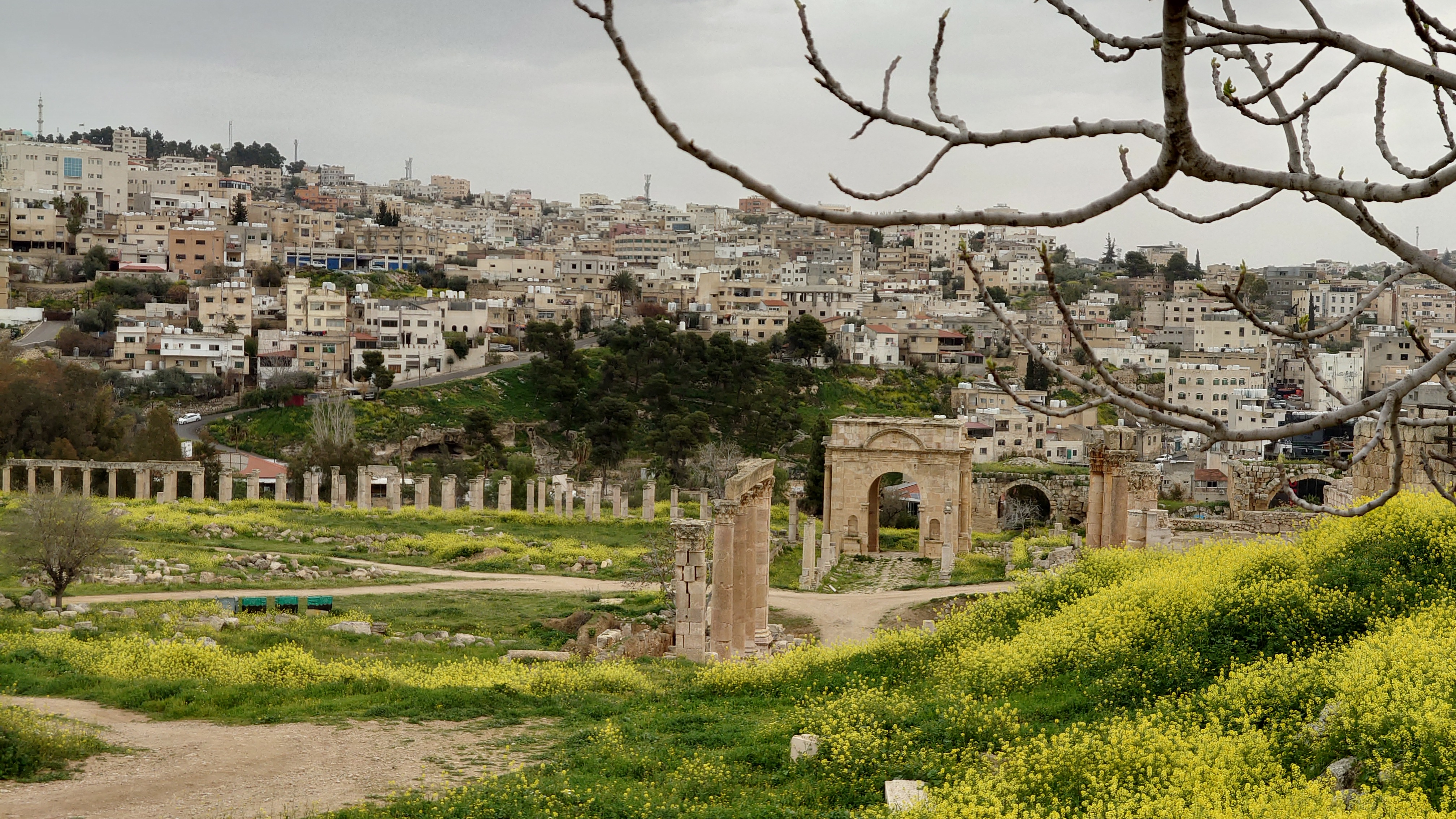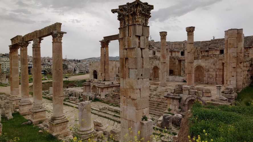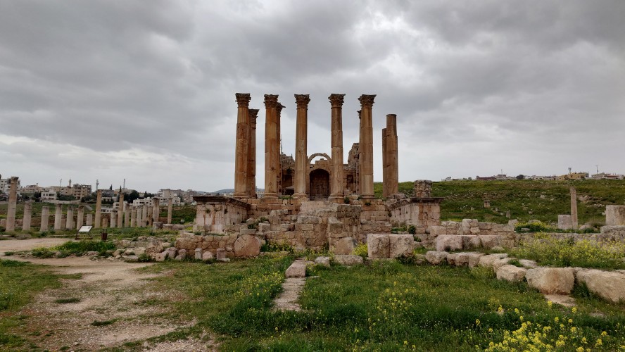 Das Areal ist groß und bietet eine Stätte einer antiken Stadt, die ebenso beeindruckend erhalten ist wie Umm Qais und es beeindruckt mich sehr, wie die alten Straßenzüge erhalten sind, mit Zebrastreifen und Gullideckeln, die sogar manchmal noch eiserne Haken zum Anheben montiert haben. Drei Stunden schlendere ich alleine durch das Areal Vieles ist griechischem Ursprungs nach Alexander dem Großen entstanden. Der Raps blüht und es duftet entsprechend intensiv. Ein tolles Bild, die Regelwolken und der Raps, dazwischen die Ruinen. Eine ganz andere Stimmung offenbart sich, wenn nicht die sonst typsichen, sandfarbenen Töne im Süden bzw. im Mai das Farbbild bestimmen.