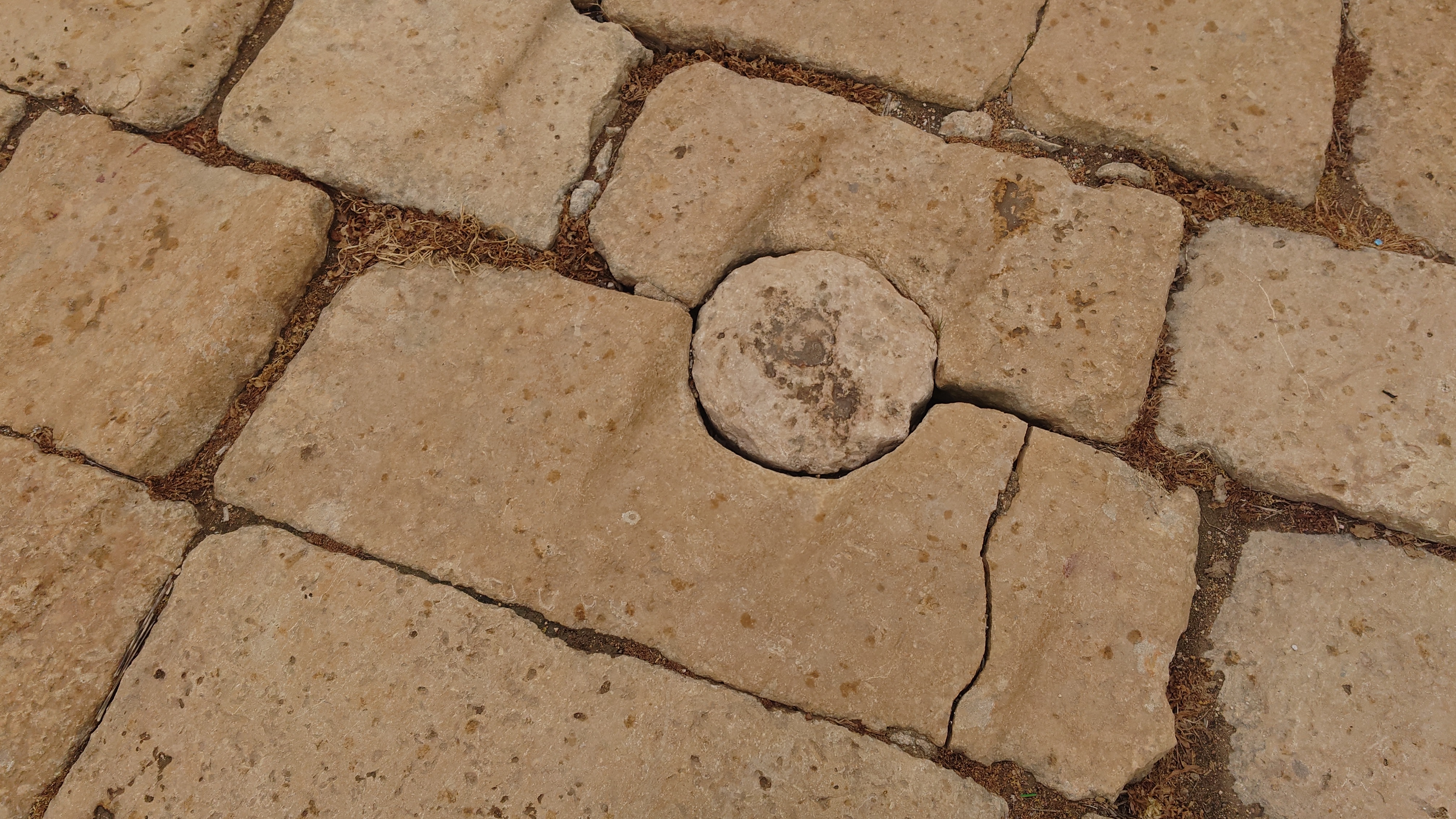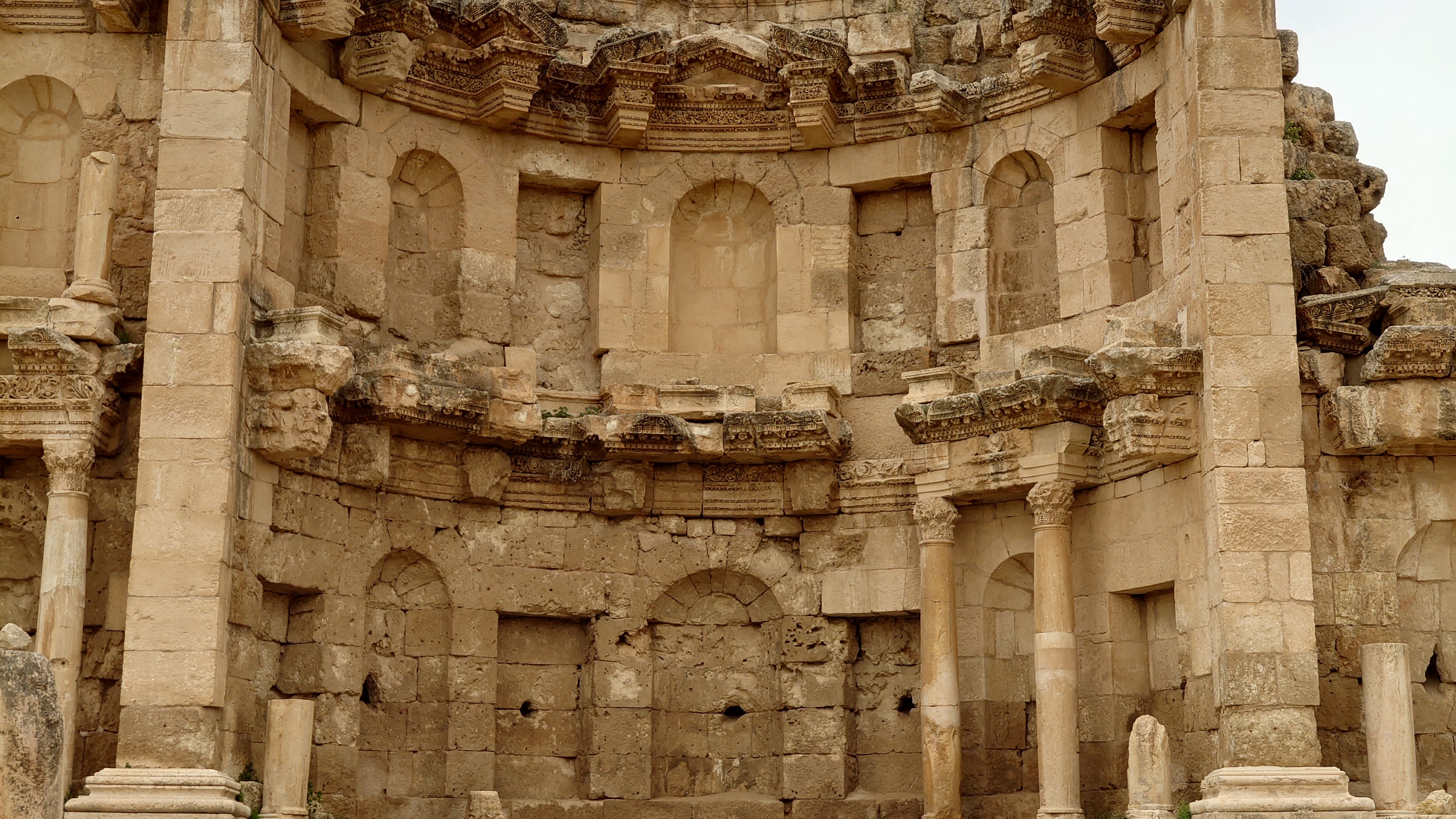 Hmmm... wie wohl Buderus-Gullideckel in 2000 Jahren aussehen werden, frage ich mich. Es gibt sogar zwei Theater und das Herzstück, ein ovaler mit Säulen umrahmter Platz. Im Süstheater höre ich Dudelsackmusik und Getrommel und es zieht meine Aufmerksamkeit auf sich. In der Mitte des Theaters liegt ein Fell und eine auffällige, weiße Kiste. Was ist das?..... Ich hätte mal nicht neugierig sein sollen. Kaum bin ich im Zentrum des Theaters bei der Kiste, kommen wie auf Knopfdruck aus einem zweiten Eingang zwei Tourifänger mit besagter Trommel und Instrument heraus und fangen an "Just for me" zu spielen. Sie fixieren mich regelrecht. Sie spielen irgendwelche Dudelsackgassenhauer und zeigen fortlaufend auf eine weiße Box, auf der "Tips" steht. "Welcome! Only 10 JD, my german friend!" Ich könnte kotzen. Das merkt auch der Himmel und schickt unvermittelt einen Platzregen. Die beiden flüchten und ich kann durch einen Hinterausgang entkommen in Richtung Artemistempel. 12 beeindruckende Säulen stehen dort. In einer Nische hockt ein Edelsteinverkäufer in einem kleinen Zelt und bittet mich herein. Ich will nichts!, sage ich bestimmt. Das macht nichts, antwortet er. "Not a great job here in war Times" sagt er und lacht. Er verkauft mir ja wirklich nichts. Ich sitze 10 Minuten unter seiner Plane und spiele mit seinen Halbedelsteinen herum. Er lässt mich in Ruhe. Tatsächlich fesselt etwas meine Aufmerksamkeit: eine Mondsteinkugel. "What you like" sagt er, als ich frage, was sie kosten soll. Ich bin schockverliebt und muss sie haben und drücke dem Kerl 10 JD in die Hand. Er freut sich. Und ich freue mich. Dann zeigt er mir noch, dass die Säulen am Tempel permanent in Bewegung sind. Er steckt einen Löffel zwischen die Fugen, der sich langsam auf und nieder bewegt. Selbst wenn man einen Finger in die Ritze steckt, fühlt man es. "Have no fear, I am working here for 20 years now!" sagt er.
