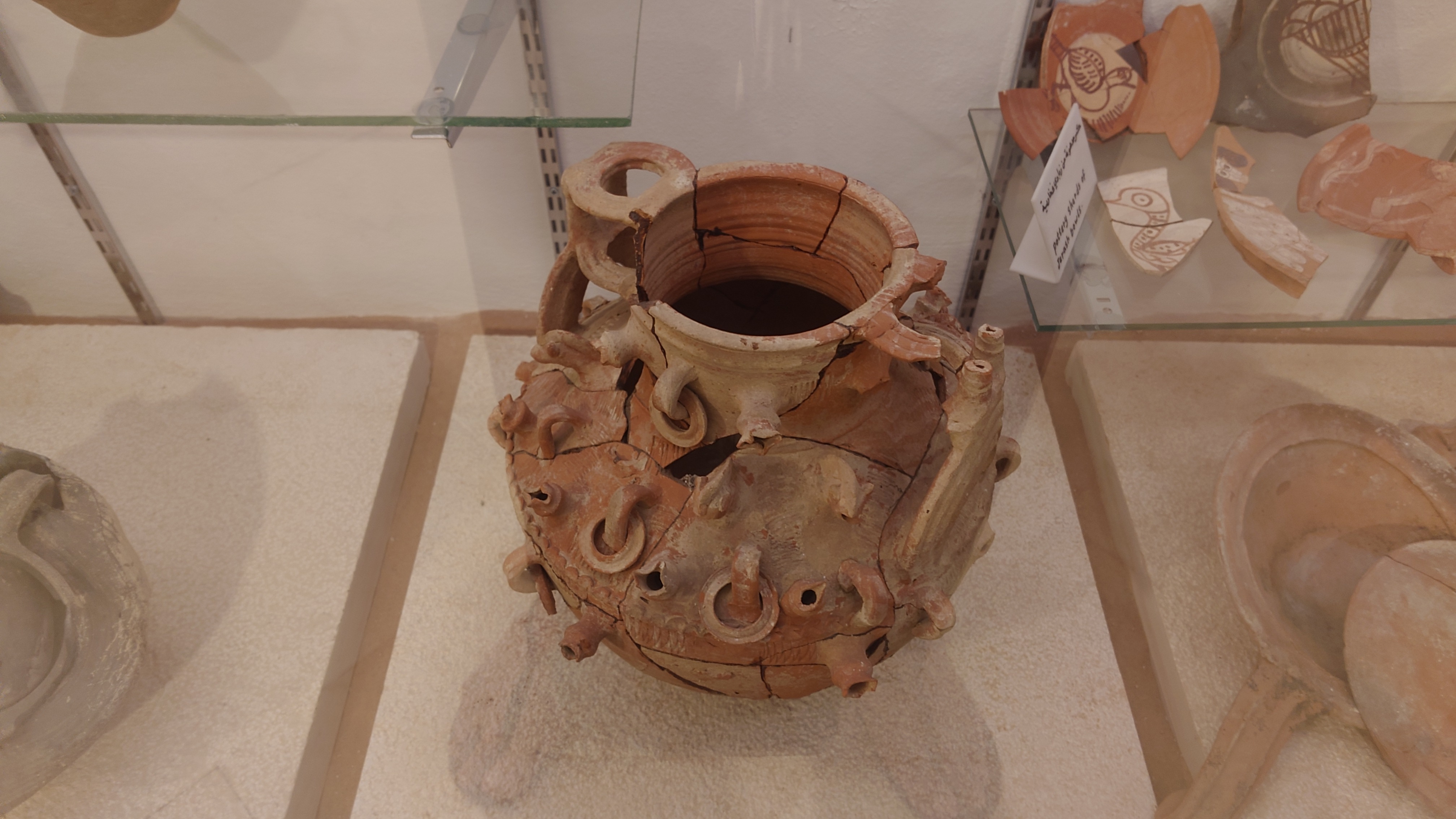 Während wir die 45 Kilometer in Richtung Norden fahren, textet ihn immer jemand an. Er soll seine Automiete bezahlen, sagt er, kann es aber zur Zeit nicht. Kaum jemand bucht ihn, auch im Taxigewerbe bleiben die Leute weg. Von daher wäre es ein Glücksfall, dass er mich gestern am Busbahnhof abgefangen hat. So hat er heute wenigstens eine Fahrt. Er würde natürlich gerne viel mehr mit mir machen und zählt alles Sehenswerte auf. Nur an all diesen Gegenden bin ich schon zu Fuß gewesen. Ich stelle immer mehr fest, dass Jordaniens Kultur und Leben sich auf einem Schmalen Grad entlang des Jordantals und auf den Anhöhen befindet. Weiter nach Osten kommt faktisch nichts mehr, außer Wüste. Auch gestern auf der Autobahn konnte ich es die ganze Strecke über beobachten. Auf Streetmaps kann man sehen, dass es noch vereinzelte Ortschaften gibt, um welche hunderte, kreisrunde, bewässerte Felder angelegt wurden.