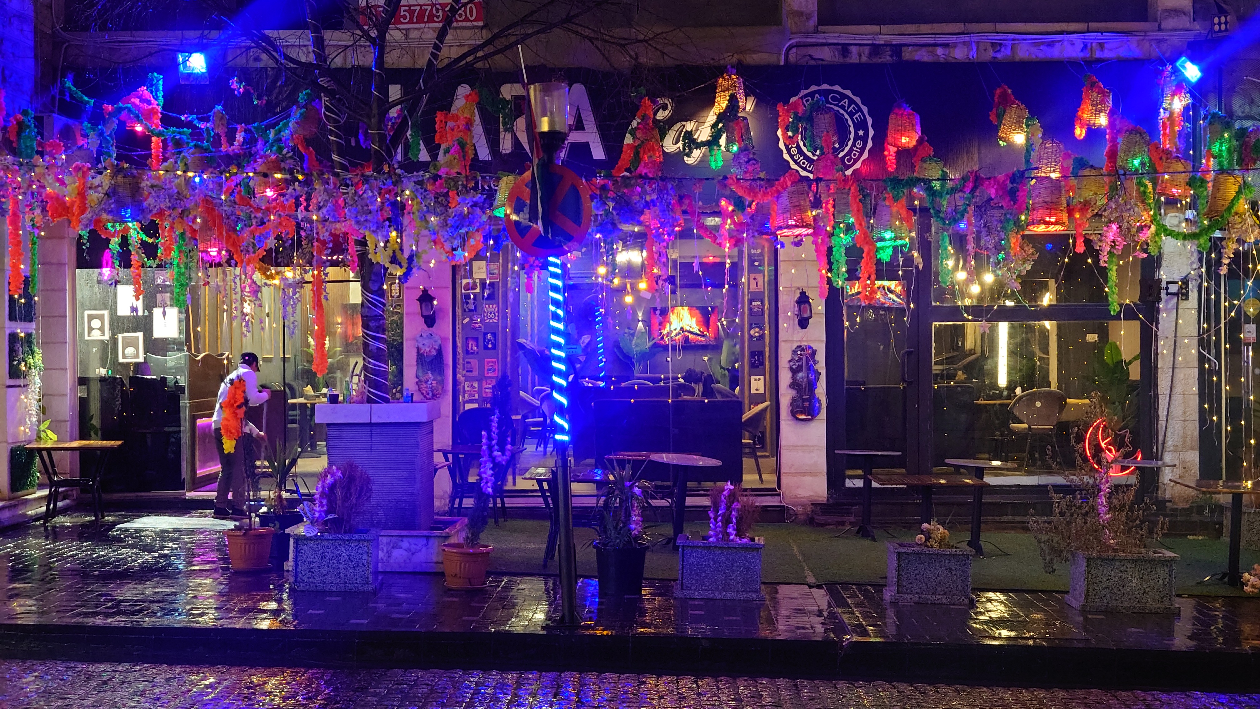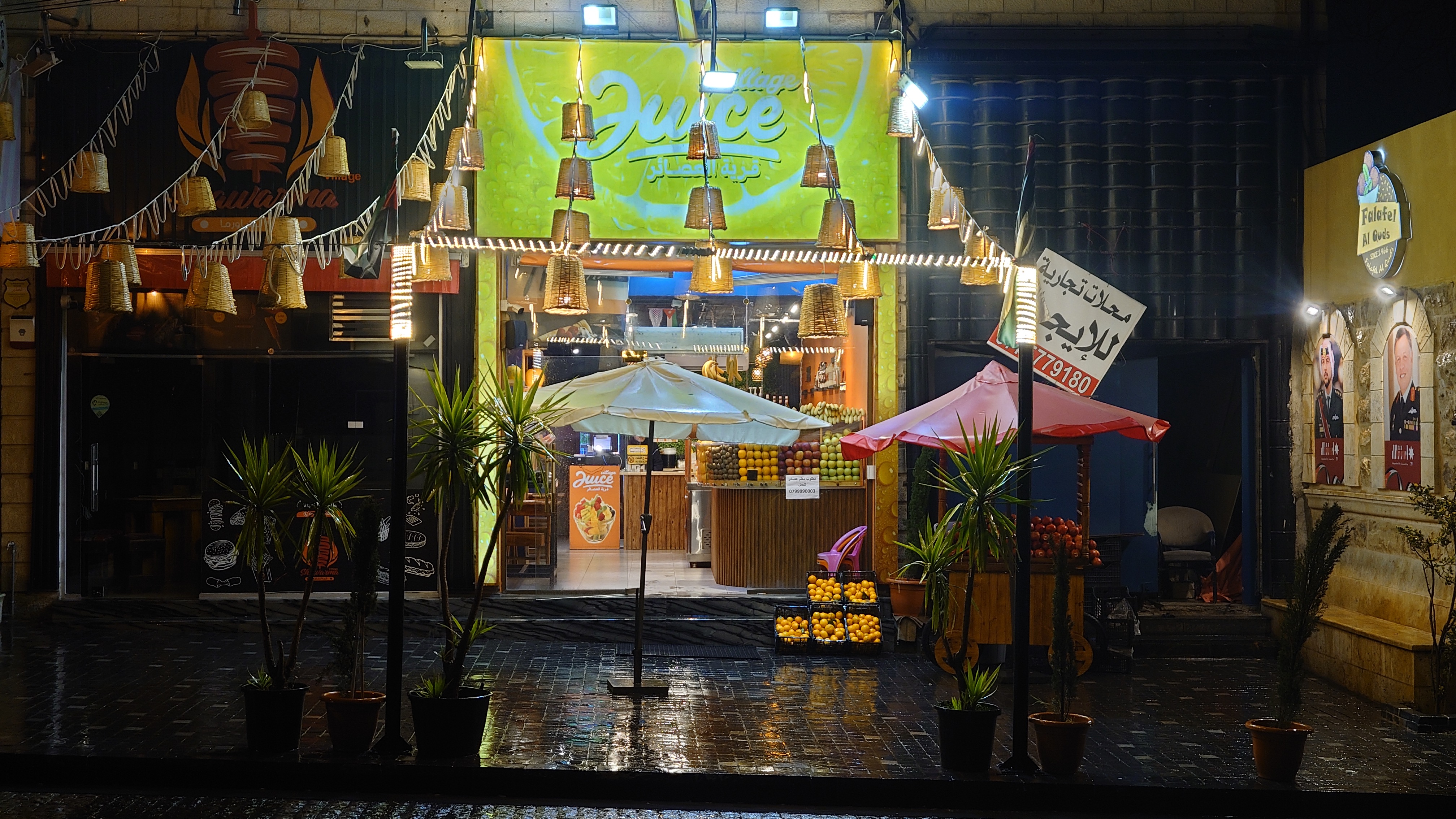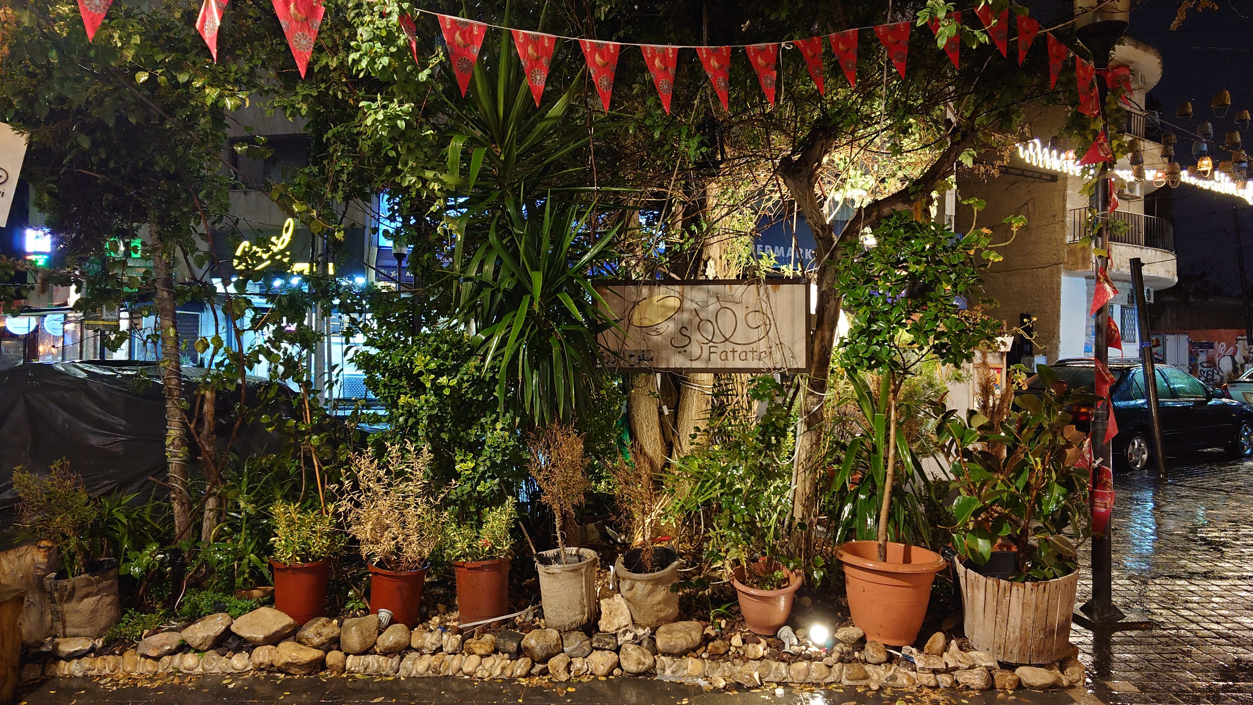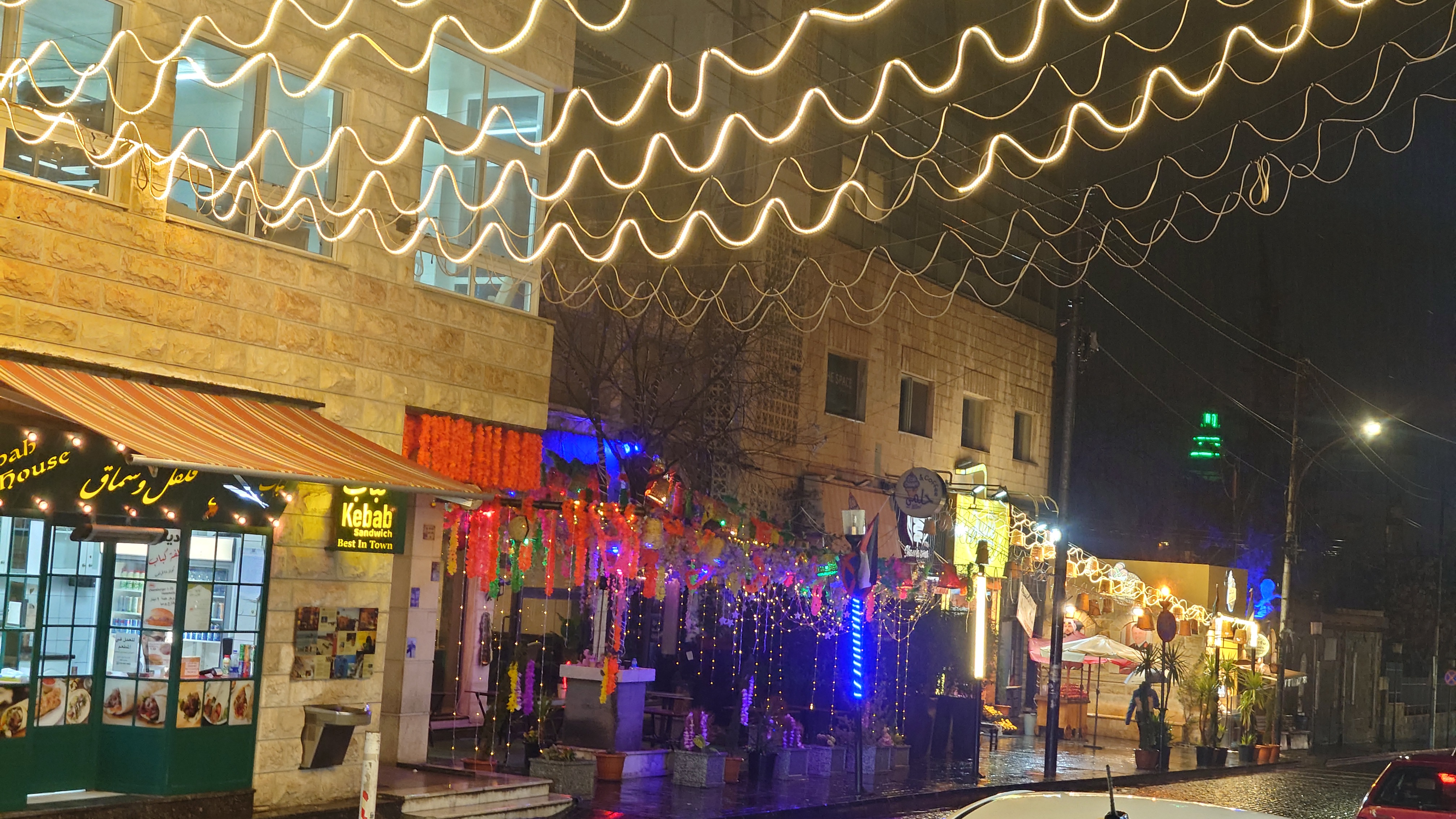 Es wird langsam dunkel. Hier jetzt nur rumzuhängen, habe ich keine Lust und gehe nochmal raus und halte mir ein Taxi an. Ich möchte die vermeintlich sagenumwogene Rainbow Street gerne sehen, die Krämerbrücke Ammans, das Portobello Jordaniens, das Holländerviertel des Ostens... oder so. Es regnet weiter in Strömen. Die Straße soll bunt erleuchtet sein, dann habe ich wenigstens coole Reflektionen. Das Taxi hält an einer Ecke. Hier soll das sein? Joa, da steht Rainbow St. Ich habe aber gelesen, dass der Ursprung des Namens auf das Rainbow Cinema zurückgeht, das hier in den 70ern war. Das war ein Spitznamey der irgendwann damm tatsächlich dazu führte, dass die ursprüngliche Abu Bakr al-Siddiq Straße umbenannt wurde. Die Straße wird aber erst auf den dritten Blick interessant. Es funkelt in allen Farben, die schreckliche LED Gierlanden mit defekten Trafos so hergeben. Aber es gibt eben ein paar spannende Läden und Hotspot-Restaurants, wo es jetzt um 18:30 alle möglichen Leute hinzieht. Bestimmte Restaurants sind gerammelt voll mit Leuten, die vor leeren Tellern sitzen und sich unterhalten. Wir wird dann auch schnell klar warum. Sie haben sich schonmal einen Sitzplatz ergattert, müssen mit dem Essen aber warten, bis 18:52 Uhr ist und Allah gerufen wird. Ramadan Kareem Buffets werden überall vorbereitet. 9.99 JD kostet es überall. Ich geselle mich im "Crazy House" zu der wartenden Gemeinschaft. Hab Hunger ohne Ende. Dann ist es soweit. Der Muezzin ruft den Allerheiligsten mit den 99 Namen endlich an. Wie nach einem Startschuss stehen alle auf, um das Buffet zu plündern. Es gibt alles, was die jordanische Küche hergibt in Mengen und jeder haut sich Berge von Essen auf die Teller. Das scheint bei Ramadan also eine Art Tradition zu sein, so essen zu gehen mit der ganzen Familie. Ich sitze wieder wie ein Alien mittendrin und genieße tatsächlich ein wenig die herzliche Aufmerksamkeit. Alles an Essen wird mir erklärt, auch wenn es nur griechischer Salat ist. Dabei gibt's Limo. Ich bin ja eigentlich ein zuckersüßer Zahn, aber dieses Konzentrat musste selbst ich mit 500ml Wasser verdünnen. Wie bekommen die das unter. Irgendwann leeren sich die Teller und die Luft füllt sich mit dem süßen Qualm der Shishas. Ich bin herrlich satt und ziehe mal weiter hinaus in die Nässe.