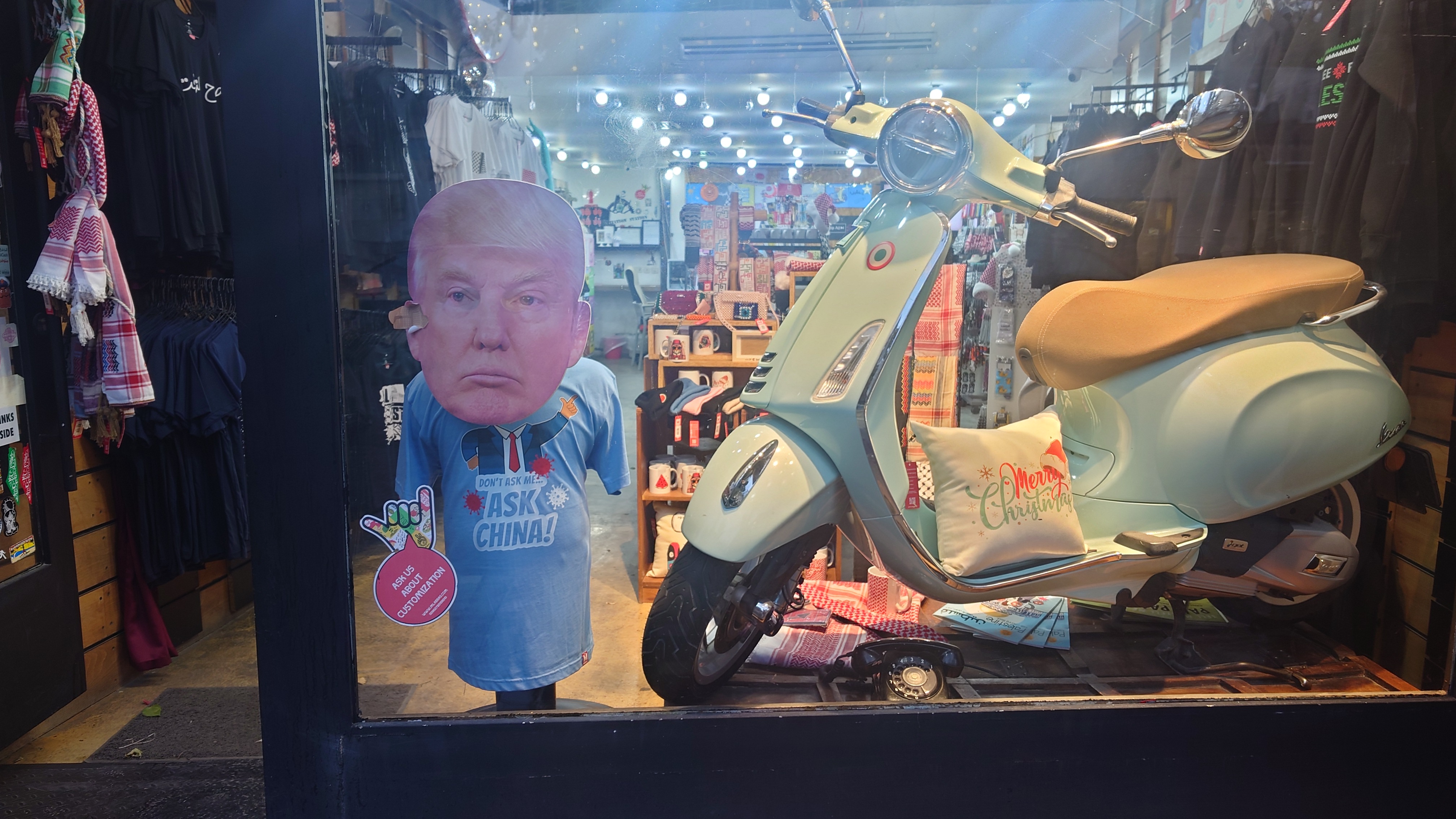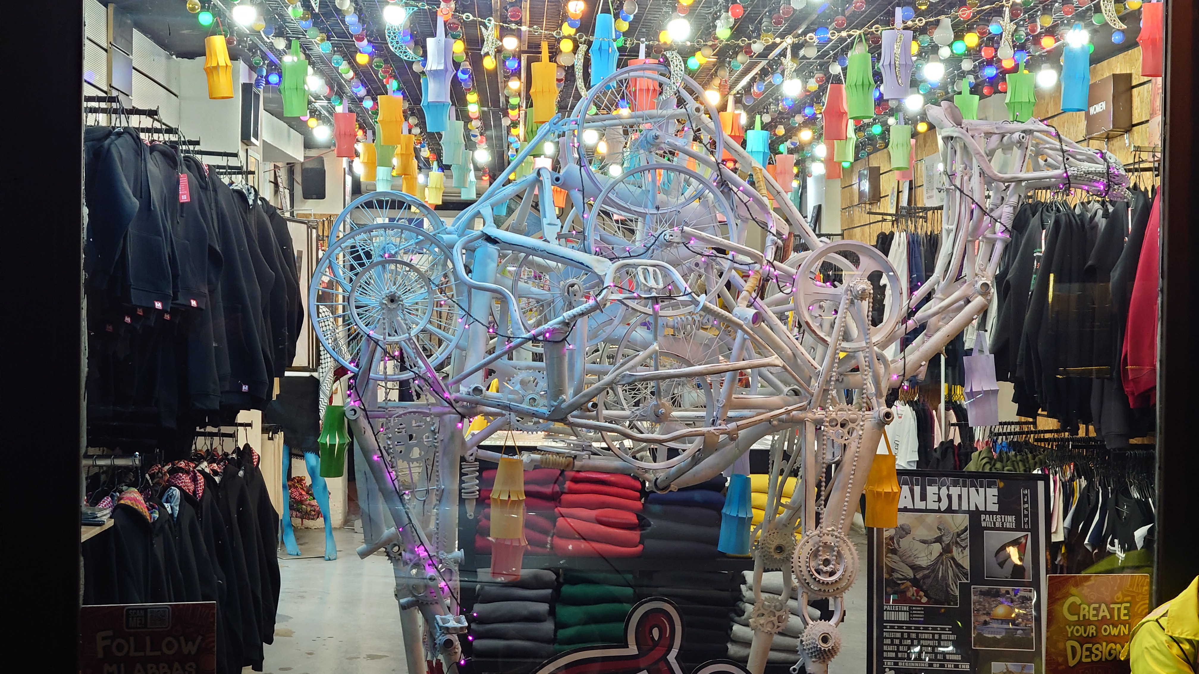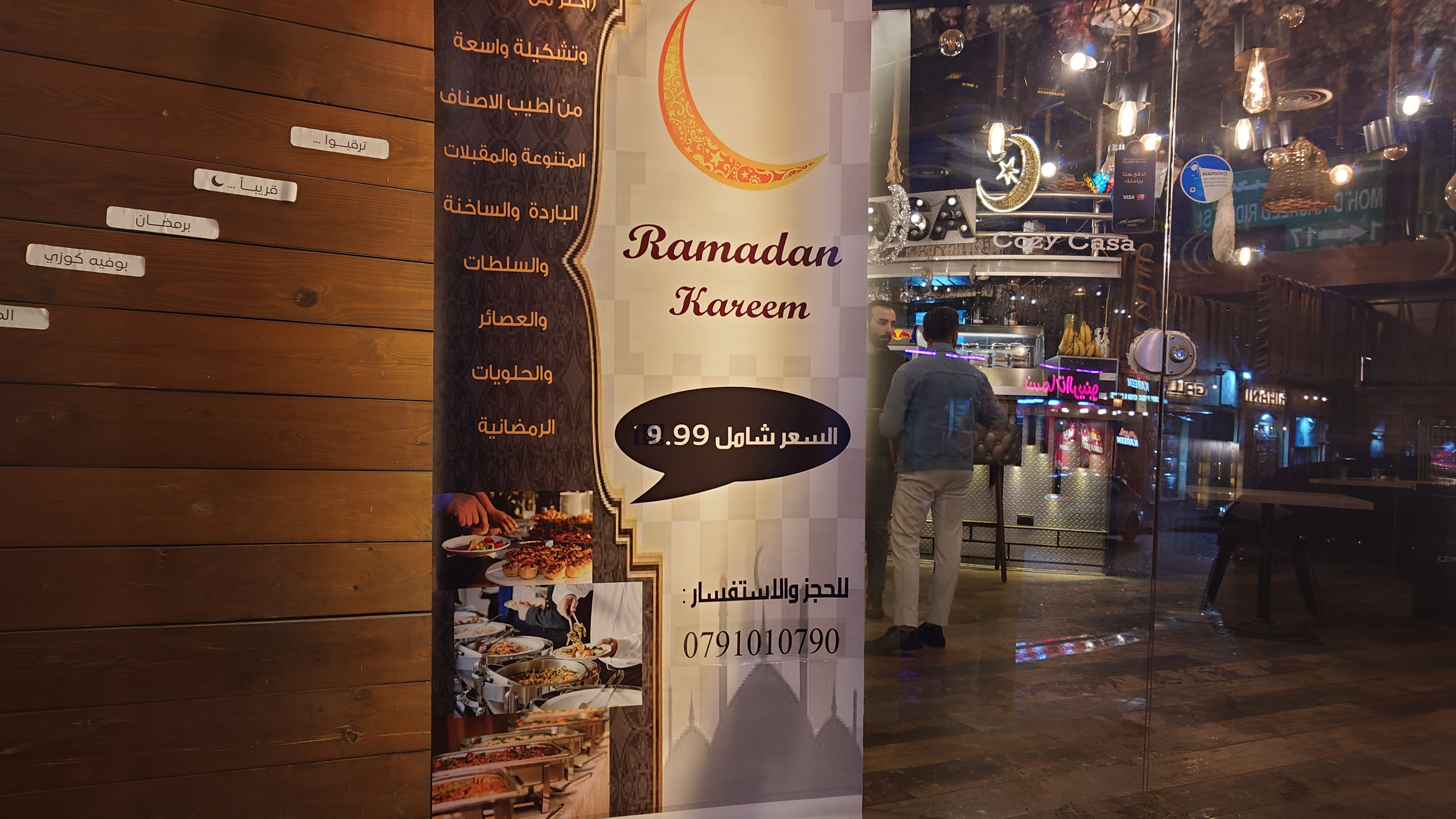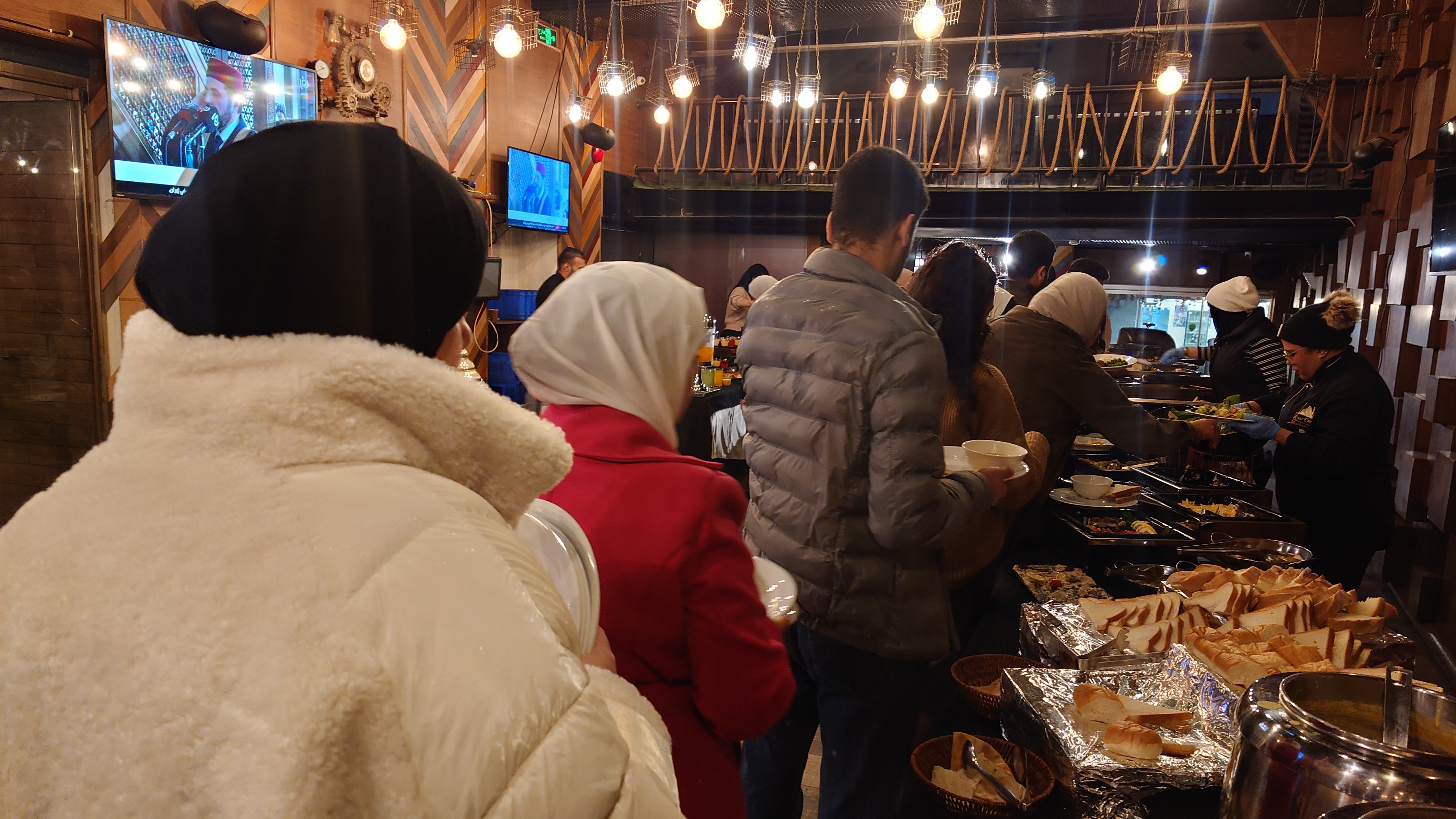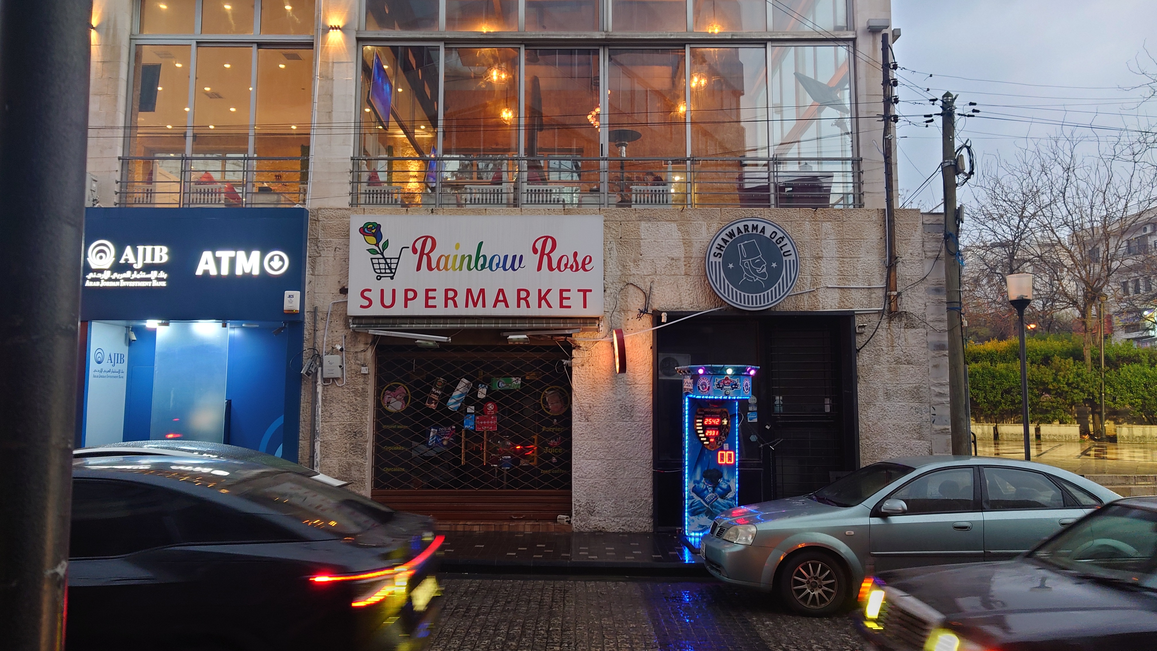 Es wird langsam dunkel. Hier jetzt nur rumzuhängen, habe ich keine Lust und gehe nochmal raus und halte mir ein Taxi an. Ich möchte die vermeintlich sagenumwogene Rainbow Street gerne sehen, die Krämerbrücke Ammans, das Portobello Jordaniens, das Holländerviertel des Ostens... oder so. Es regnet weiter in Strömen. Die Straße soll bunt erleuchtet sein, dann habe ich wenigstens coole Reflektionen. Das Taxi hält an einer Ecke. Hier soll das sein? Joa, da steht Rainbow St. Ich habe aber gelesen, dass der Ursprung des Namens auf das Rainbow Cinema zurückgeht, das hier in den 70ern war. Das war ein Spitznamey der irgendwann damm tatsächlich dazu führte, dass die ursprüngliche Abu Bakr al-Siddiq Straße umbenannt wurde. Die Straße wird aber erst auf den dritten Blick interessant. Es funkelt in allen Farben, die schreckliche LED Gierlanden mit defekten Trafos so hergeben. Aber es gibt eben ein paar spannende Läden und Hotspot-Restaurants, wo es jetzt um 18:30 alle möglichen Leute hinzieht. Bestimmte Restaurants sind gerammelt voll mit Leuten, die vor leeren Tellern sitzen und sich unterhalten. Wir wird dann auch schnell klar warum. Sie haben sich schonmal einen Sitzplatz ergattert, müssen mit dem Essen aber warten, bis 18:52 Uhr ist und Allah gerufen wird. Ramadan Kareem Buffets werden überall vorbereitet. 9.99 JD kostet es überall. Ich geselle mich im "Crazy House" zu der wartenden Gemeinschaft. Hab Hunger ohne Ende. Dann ist es soweit. Der Muezzin ruft den Allerheiligsten mit den 99 Namen endlich an. Wie nach einem Startschuss stehen alle auf, um das Buffet zu plündern. Es gibt alles, was die jordanische Küche hergibt in Mengen und jeder haut sich Berge von Essen auf die Teller. Das scheint bei Ramadan also eine Art Tradition zu sein, so essen zu gehen mit der ganzen Familie. Ich sitze wieder wie ein Alien mittendrin und genieße tatsächlich ein wenig die herzliche Aufmerksamkeit. Alles an Essen wird mir erklärt, auch wenn es nur griechischer Salat ist. Dabei gibt's Limo. Ich bin ja eigentlich ein zuckersüßer Zahn, aber dieses Konzentrat musste selbst ich mit 500ml Wasser verdünnen. Wie bekommen die das unter. Irgendwann leeren sich die Teller und die Luft füllt sich mit dem süßen Qualm der Shishas. Ich bin herrlich satt und ziehe mal weiter hinaus in die Nässe.