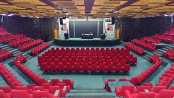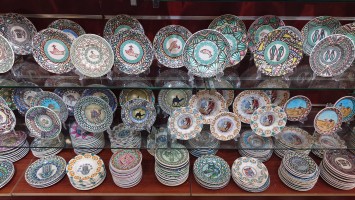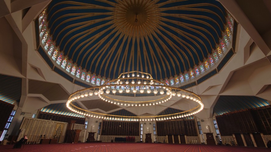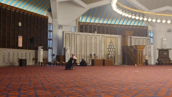 Unterhalb der Moschee befindet sich ein Konferenzraum und eine Ausstellung wichtiger Moscheen der Welt. Bilder hängen an der Wand, von Männern, die anderen Männern die Hand schütteln oder neben anderen Männerny die wichtig aussehen, in besagtem Konferenzraum sitzen. Im Eingangsbereich ist der sogenannte Wohltätigkeitsbasar mit handgemachten Souvenirs, die unter anderem von den Frauengemeinschaften angefertigt werden. Ich werde, ausnahmsweise unaufdringlich, hindurchgeführt. Besonderer Clou: sie sind in phosphorisierenden Farben bemalt. Das Licht wird ausgeschaltet und hunderte bemalter Teller erläuchten stattdessen den Raum grünlich.